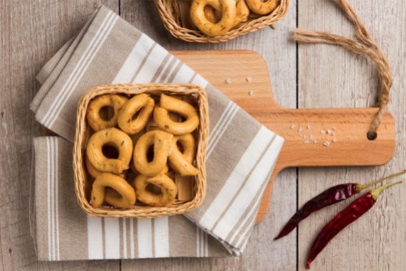 Ideali per vivacizzare antipasti e spuntini, nei tarallini al peperoncino tacco e punta della nostra penisola si incontrano idealmente dando luogo a un prodotto di frugale golosità.